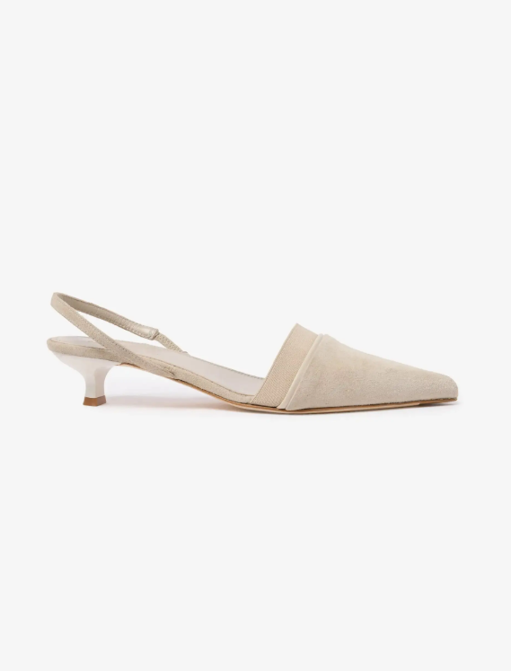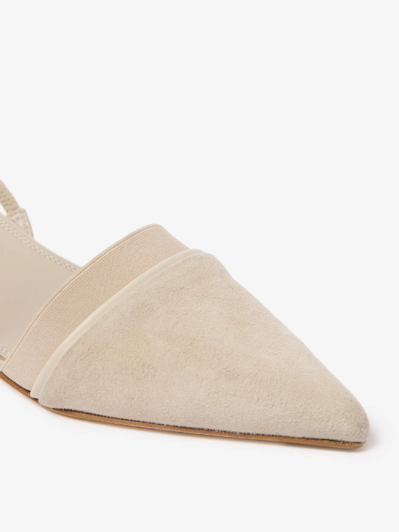 Exclusive run - A demi-heel silhouette featuring a sleek pointed toe, elastic slingback straps and a refined contrast of textures. The base is crafted from suede calf leather, while the trim is finished in nappa leather.