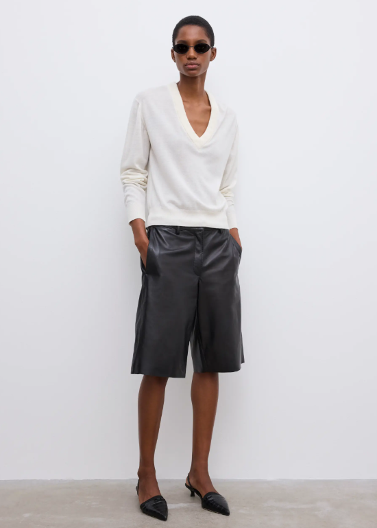 Longline shorts in buttery soft and lightweight lambskin nappa leather, featuring a low waist, relaxed leg, and below-knee length. Finished with in-seam pockets, belt loops, and a hook-and-bar closure. Half lined.