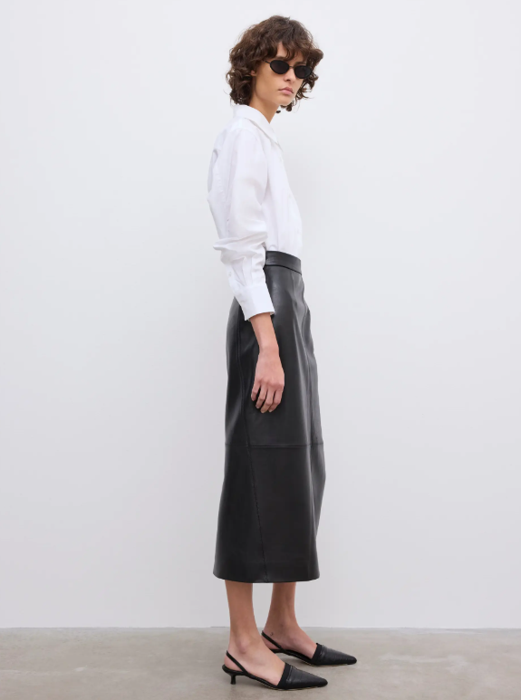 A mid-length pencil skirt in soft yet structured lambskin nappa leather with curved side seams and a two-way metal zip at the back. Fully lined.