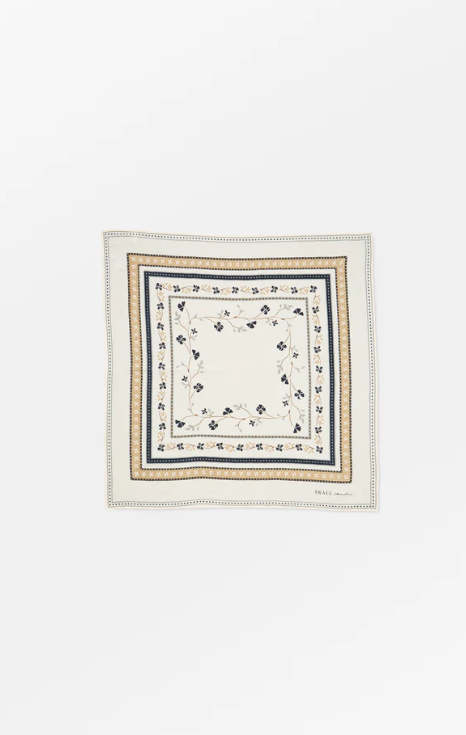 Skall Floral Scarf is a small 100% cotton scarf in a design that features delicate flowers inside a square border. It is the perfect finishing touch to an outfit when tied around the neck.